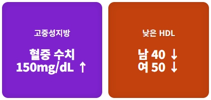 ⑤ 낮은 HDL 콜레스테롤: 남성 40mg/dL, 여성 50mg/dL 미만
