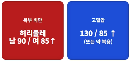 ① 복부 비만: 허리둘레 남성 90cm, 여성 85cm 이상