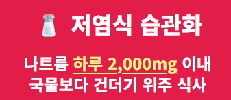 * 저염식의 생활화: 나트륨 섭취를 하루 2,000mg(소금 5g) 이내로 줄이는 것만으로도 혈압 조절에 큰 도움이 됩니다. 국물보다는 건더기 위주로 식사하세요.