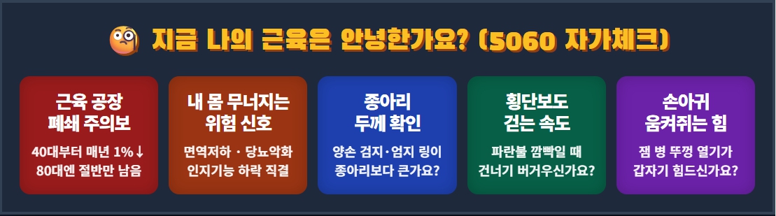 - 자연스러운 노화가 아니다: 세계보건기구(WHO)는 근감소증을 정식 질병 코드로 분류했습니다. 방치하면 일상생활 불가 상태에 이릅니다.