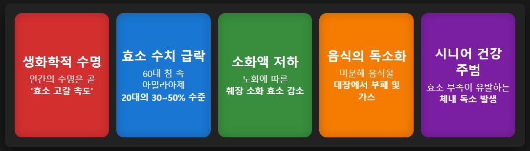 * 소화되지 못한 음식의 독소화: 효소가 부족하면 음식물이 제대로 분해되지 않은 채 대장으로 내려가 부패하게 됩니다. 이것이 시니어들이 자주 겪는 '배에 가스 차는 증상'과 '독소 발생'의 주범입니다.