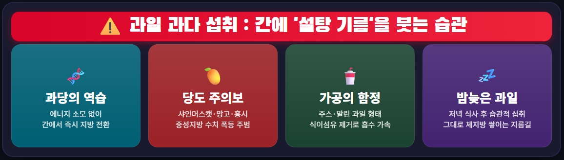 많은 어르신이 밥 대신 과일로 끼니를 대신하거나, 건강을 위한다며 매끼 대량의 과일을 드십니다. 하지만 임상 경험을 바탕으로 말씀드리면, **과도한 과일 섭취는 중성지방 수치를 올리는 최악의 습관**입니다. 과일에 든 '과당'은 포도당과 달리 에너지로 쓰이지 않고 간으로 곧장 가서 지방으로 전환됩니다. 즉, 과일을 많이 먹는 것은 간에 설탕 기름을 직접 붓는 것과 같습니다.