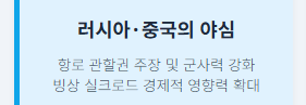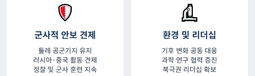 - **자원 및 항로 확보 경쟁 심화:** 지구온난화로 빙하가 녹으면서 그린란드 아래의 막대한 희토류 등 광물자원과 북극 항로의 경제적 가치가 부각되기 시작했습니다. 중국의 '빙상 실크로드' 구상과 러시아의 북극 군사력 강화는 미국에게 자원 및 항로 확보 경쟁에서 밀릴 수 없다는 위기감을 주었습니다.
