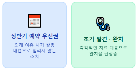 - 예약 우선권: 대학병원 외래가 비교적 여유로운 시기에 빠른 조치 가능